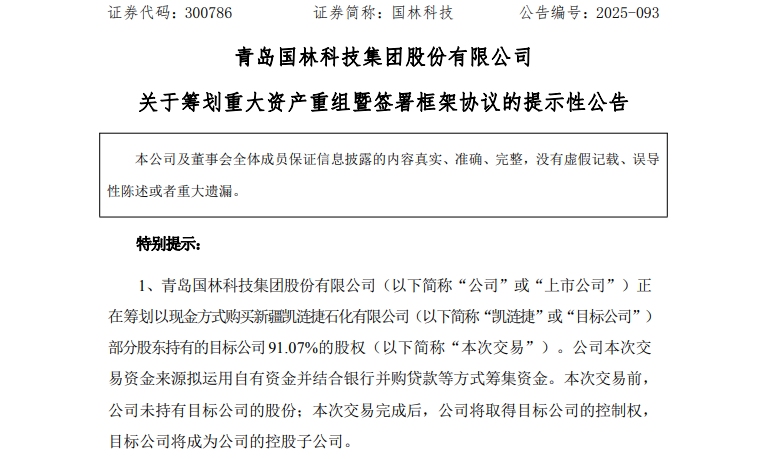 9月29日晚,国林科技(300786)公告称,公司与银邦海外化学企业有限公司(以下简称 “银邦化学”)签署了《框架协议》,拟以现金方式收购银邦化学持有的新疆凯涟捷石化有限公司(以下简称“凯涟捷”)91.07%股权。此次交易若顺利完成,国林科技将成为凯涟捷的控股股东。